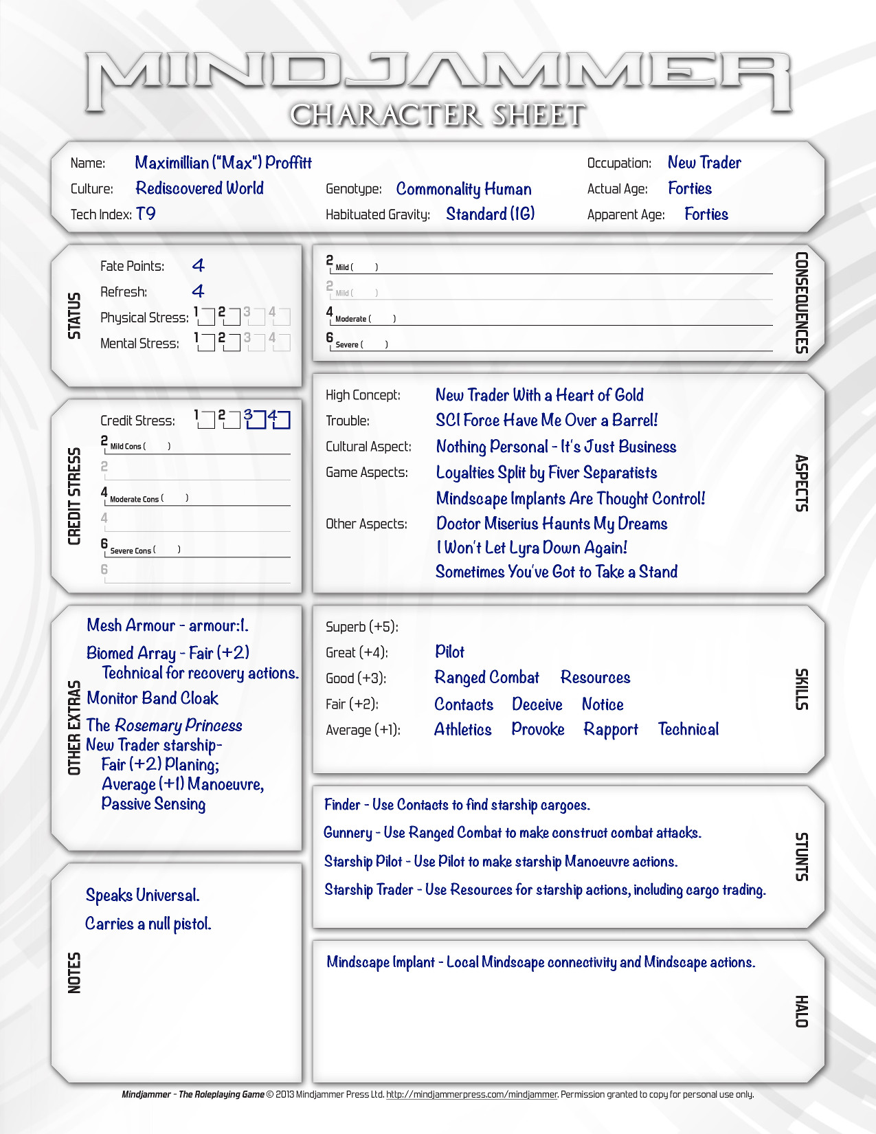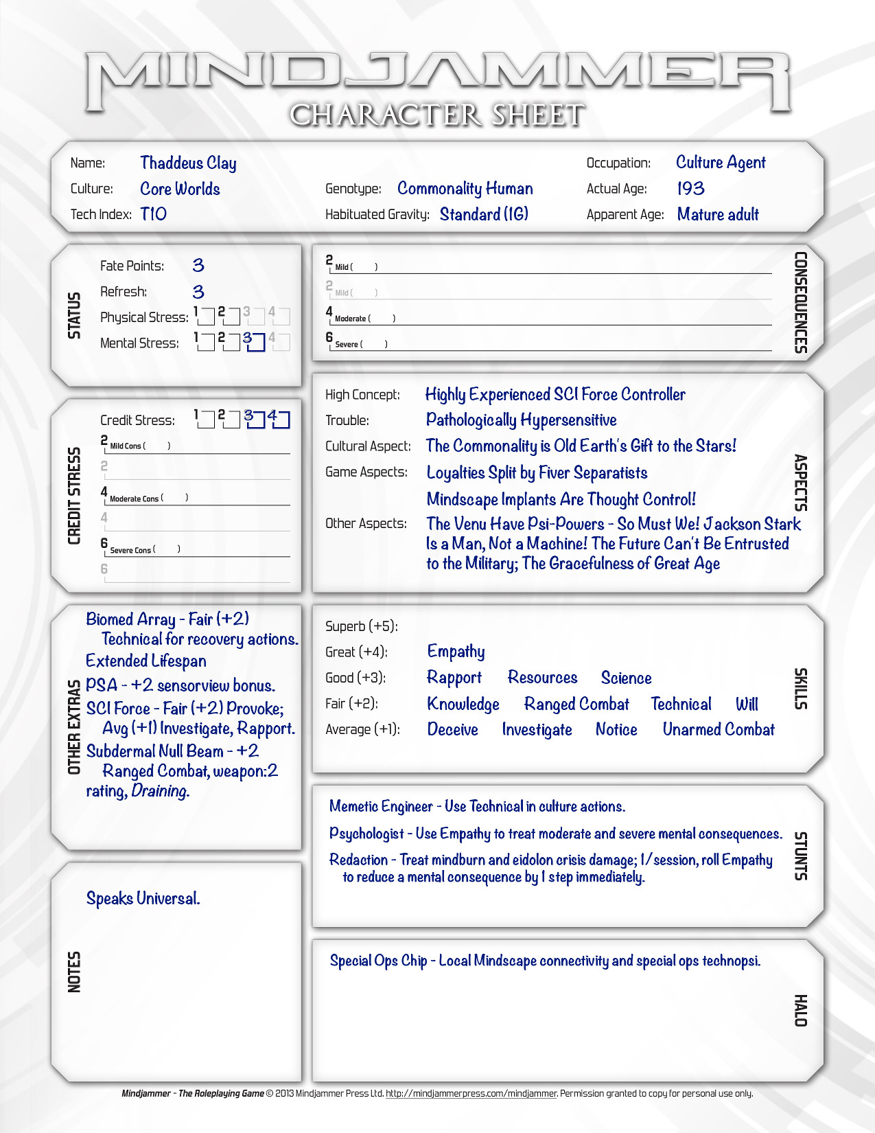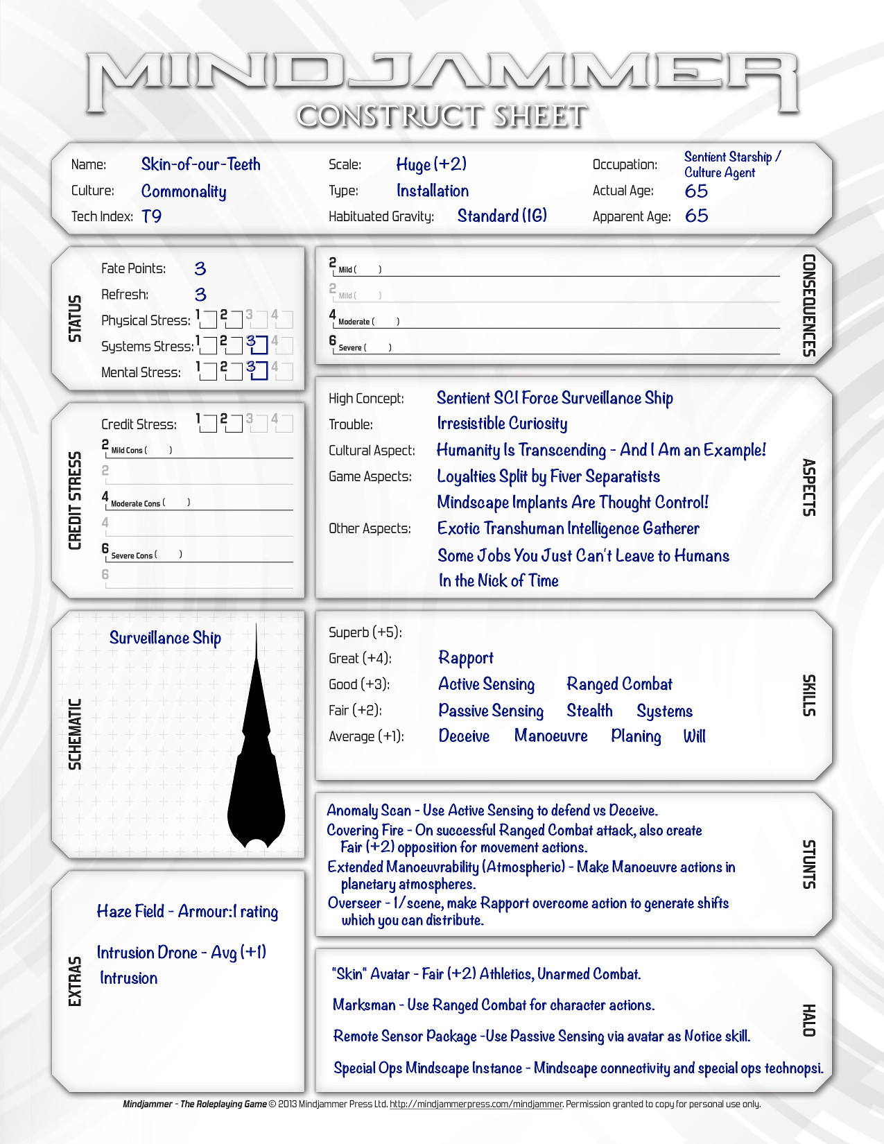 | Construct Sheet: For sentient starship characters, node minds, city sentiences, or other installation characters, or for recording detailed or shared extras such as vehicles and starships. Form-fillable version. | |